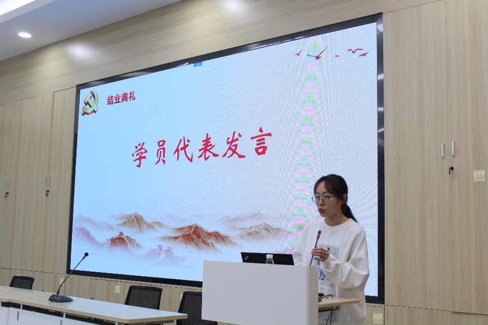 本期优秀学员代表刘欣雨发言。她历数自己在分党校参与的每一次活动,从了解非遗文化、感悟红色精神,到学习理论知识、不断躬行实践。她在读原著、学原文、悟原理的过程中,明白了新中国取得的伟大成就,离不开中国共产党的领导。她宣誓,作为青年,要在前进的征程中主动担当、践行使命、勇于奉献,在奋斗中释放青春激情、挥洒青春热血、奉献青春力量。