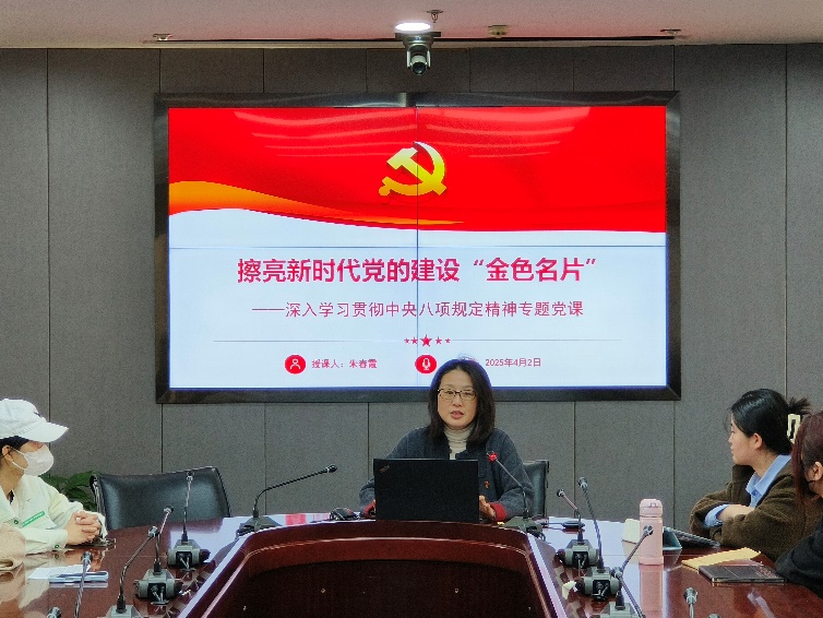 随后,院党委副书记、副院长朱春霞老师以“擦亮新时代党的建设金色名片——深入学习贯彻中央八项规定精神”为题,为支部党员上了一堂精彩的专题党课。朱书记从中央八项规定精神的出台背景、核心要义、实践成效及未来展望等多个方面进行了深入浅出的讲解,她强调,中央八项规定精神是新时代全面从严治党的亮丽名片,必须持之以恒、久久为功地抓好贯彻落实。紧接着,支部书记单老师带领大家共同学习了中央八项规定精神的具体内容,通过逐条解读、案例剖析等方式,使大家对八项规定精神有了更加全面、深刻的理解。