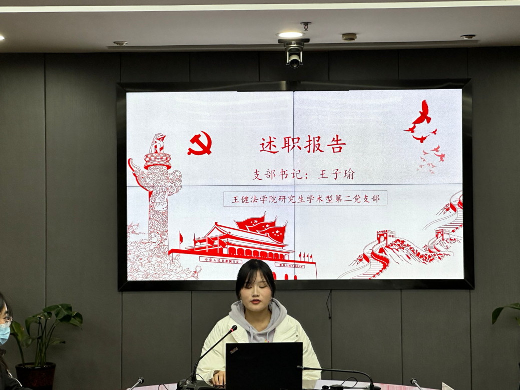 法律硕士(非法学)一支部书记陈云帆汇报了本年度的基本工作情况,年度工作包括:深化理论学习,不断夯实党员的思想基础;淬炼实践能力,积极奉献党员的红色力量;培养良好风气,树立廉洁奉公的党员形象;完善支部管理,发挥基层支部的灵活优势四方面。并总结了其工作的不足,如在新生党员档案转接出现失误以及活动形式较为单一,党员之间的沟通较少的问题,并在此基础上提出了未来工作思路的调整与总结。