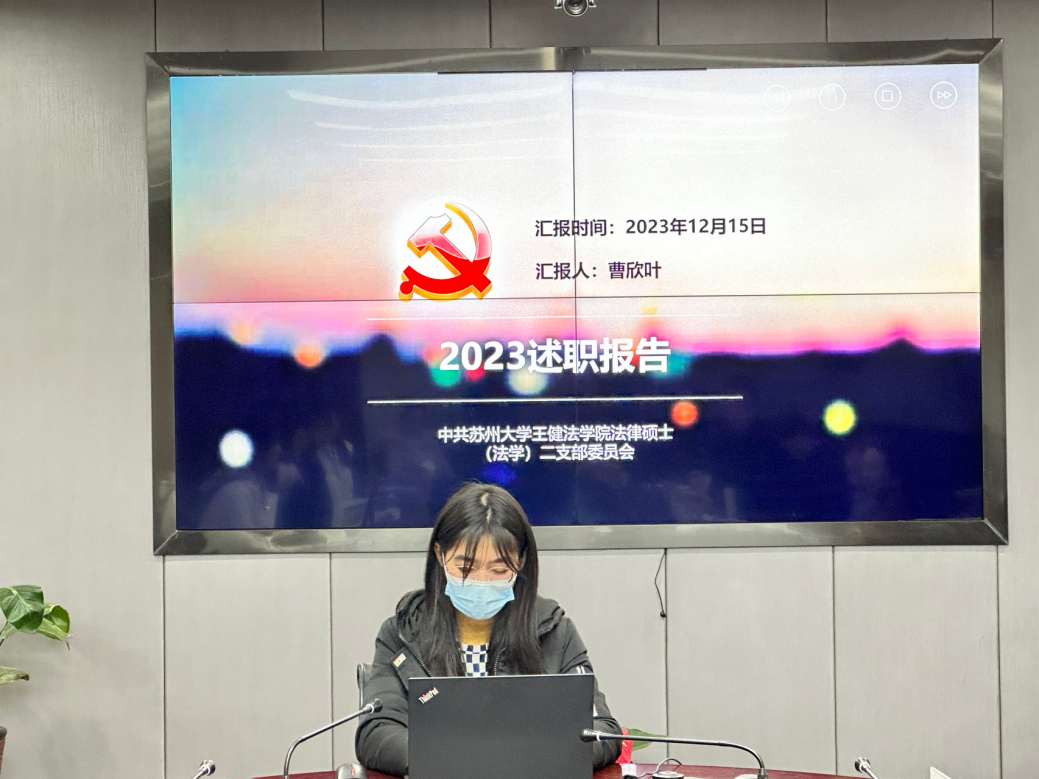 法律硕士(非法学)二支部组织委员杨悦代为述职,总结了支部的年度工作,并且陈述了其支部的特色活动,如:积极响应大学生创新创业大赛“青年筑梦红色之旅”活动,投身社会 实践,组织支部成员组队参加,创建“苏”绣“黔”程——苏黔蚕桑刺绣商旅项 目,为推进革命老区、贫困地区、城乡社区经济社会发展献计献策。在党日活动的开展中,更加积极开展特色党日活动,扎实推进两学一做常态化、创新化,开展实景读书会、红色观影、实践基地 考察等紧跟时事、形式新颖、内容深刻的主题学习活动。如走访革命博物馆感悟 十九届六中全会精神、跟随总书记脚步走近平江历史文化。