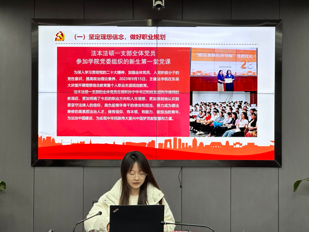 法律硕士(法学)一支部书记姜语晨汇报了本年度的基本工作情况,包括坚定理想信念,做好职业规划;重游革命圣地,赓续红色血脉;强化理论学习,推进主题教育四方面。并提了今后支部的努力方向,在未来争取做到加强支部标准化规范化建设,创新并丰富党日活动形式,调动党员同志参与活动的积极性,把握党员发展流程,认真做好党员发展工作,加强自身理论学习,同时完善支部党员理论学习,相互交流,激励党员同志持续发挥先锋模范作用。
