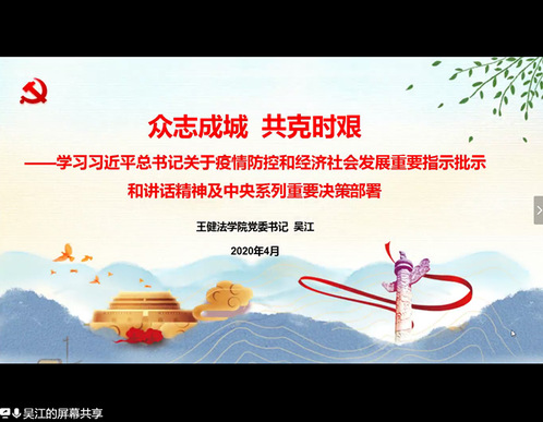 疫情防控工作的简要回顾”这三方面展开。吴江书记以播放视频的形式给大家展示了疫情发生以来,以习近平同志为核心的党中央开展的一系列战疫工作,带领大家从八个方面学习了习近平总书记关于疫情防控和经济社会发展作出的系列重要指示批示讲话精神以及中央的重要决策部署,并谈了个人的学习体会,和大家共勉。最后,吴书记从人妻无码应急机制、工作部署、教学科研工作安排、关注教师同学身心健康、营造积极的舆论氛围、支部战斗堡垒和党员先锋模范作用发挥等六个方面介绍了人妻无码