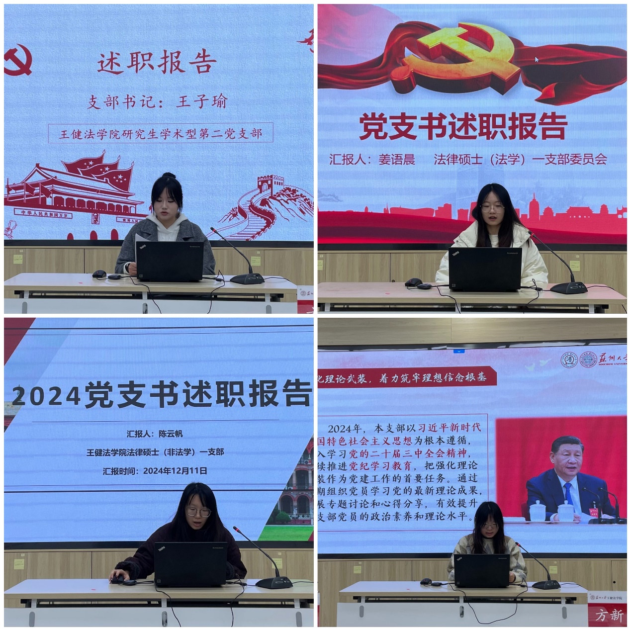 本一支部书记单杰老师做重点述职。本一支部既是学校样板支部本一支部,也成功入选第四批“全国党建工作样板支部”培育创建单位。本一支部重点介绍了“卓越法治人才”培养的“一三五”党建工作法,即:一个党建育人品牌、三大党建育人宗旨、五彩党建育人行动。