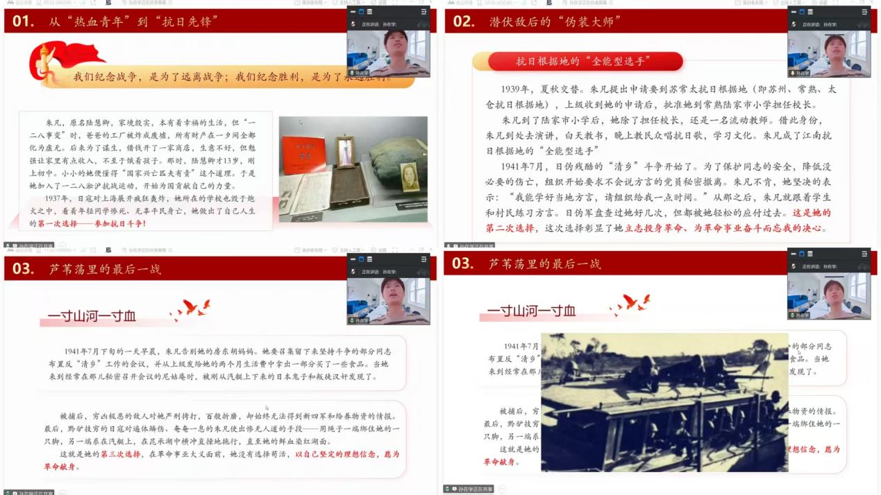 孙在学同志回顾了朱凡同志在抗日战争最艰苦时期的光辉事迹。这位江南抗日义勇军的英雄,在1941年日伪“清乡”期间,带领群众在芦苇荡中与敌人周旋,建立秘密交通站,用竹筏运送药品、传递情报。当叛徒出卖导致根据地失陷时,朱凡主动断后掩护战友突围,被捕后面对严刑拷打始终高呼“中国共产党万岁”,最终在沙家浜的芦苇丛中壮烈牺牲,年仅22岁的她用生命践行了“纵然是刀山火海,也熄灭不了信仰的火炬”的铮铮誓言。